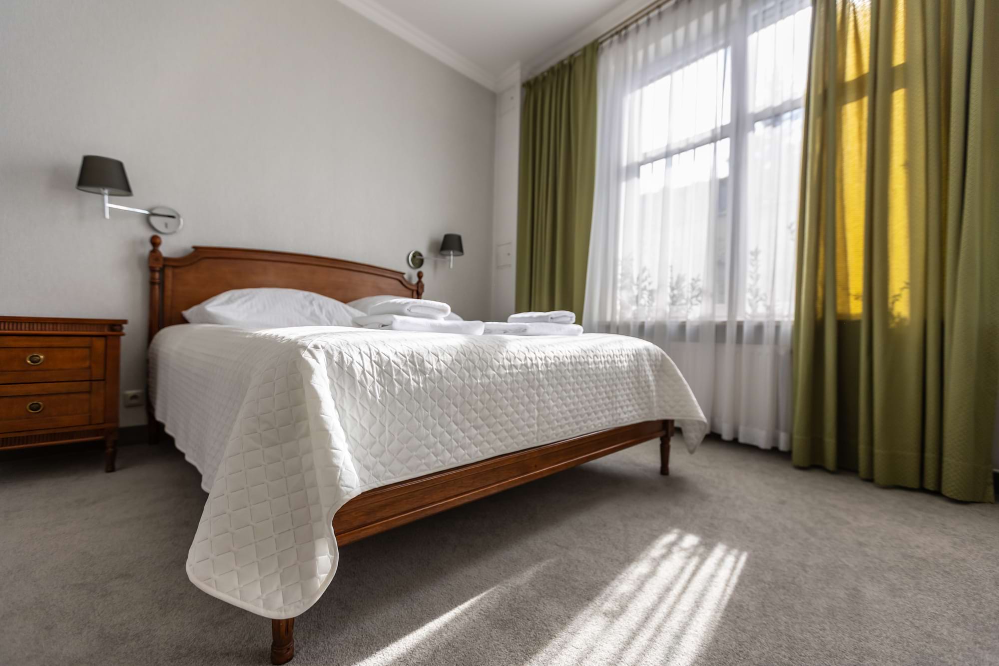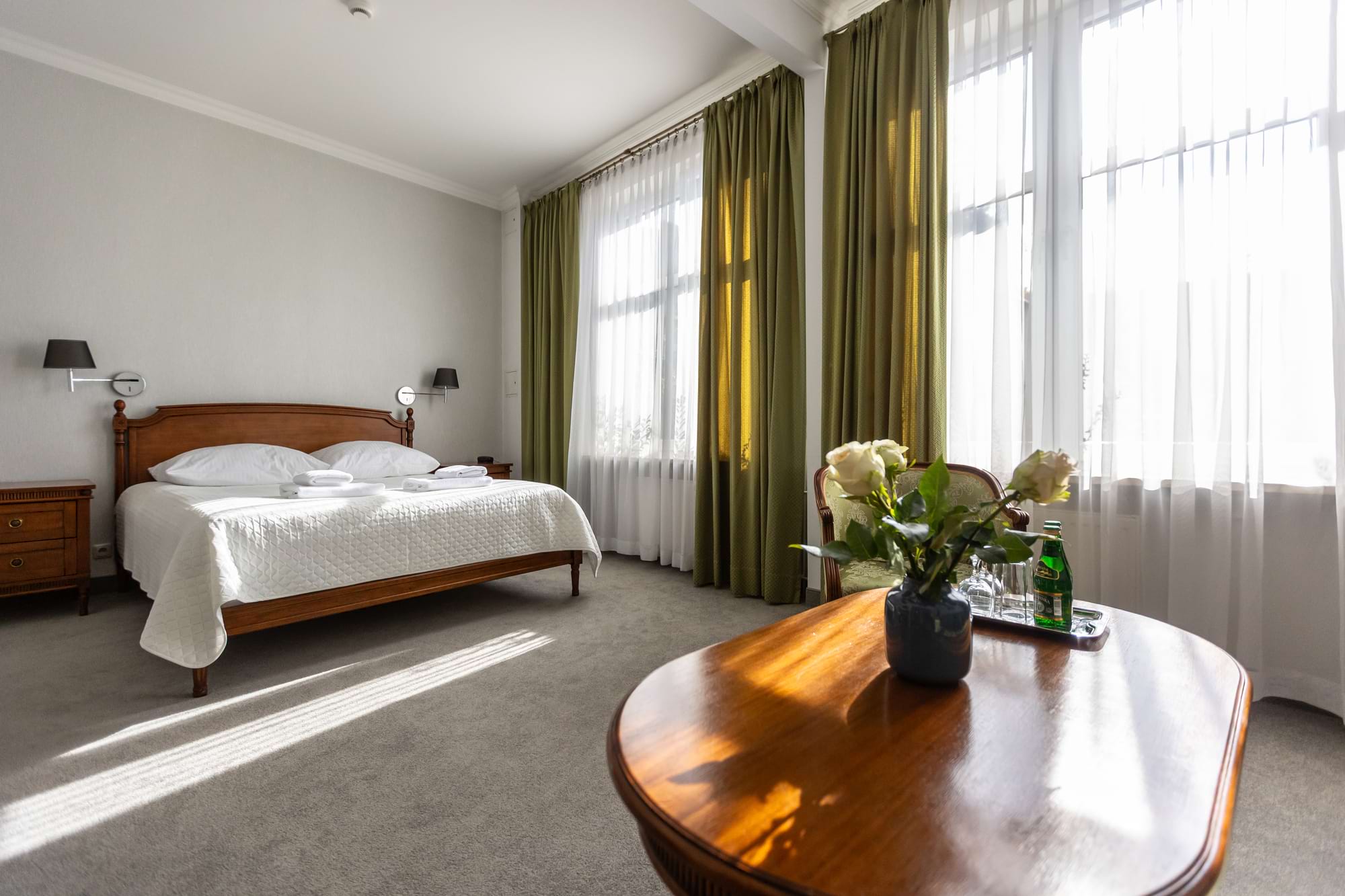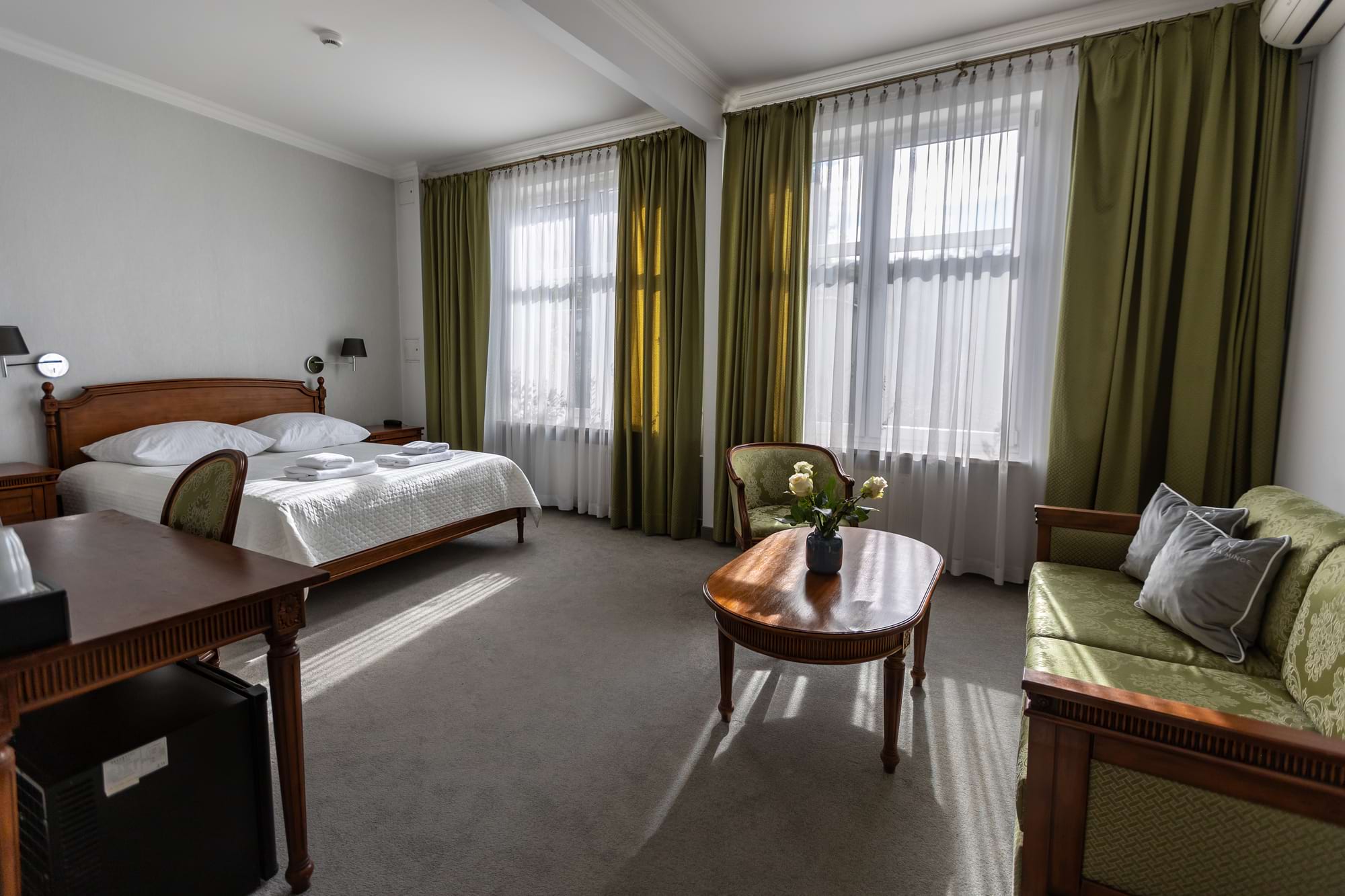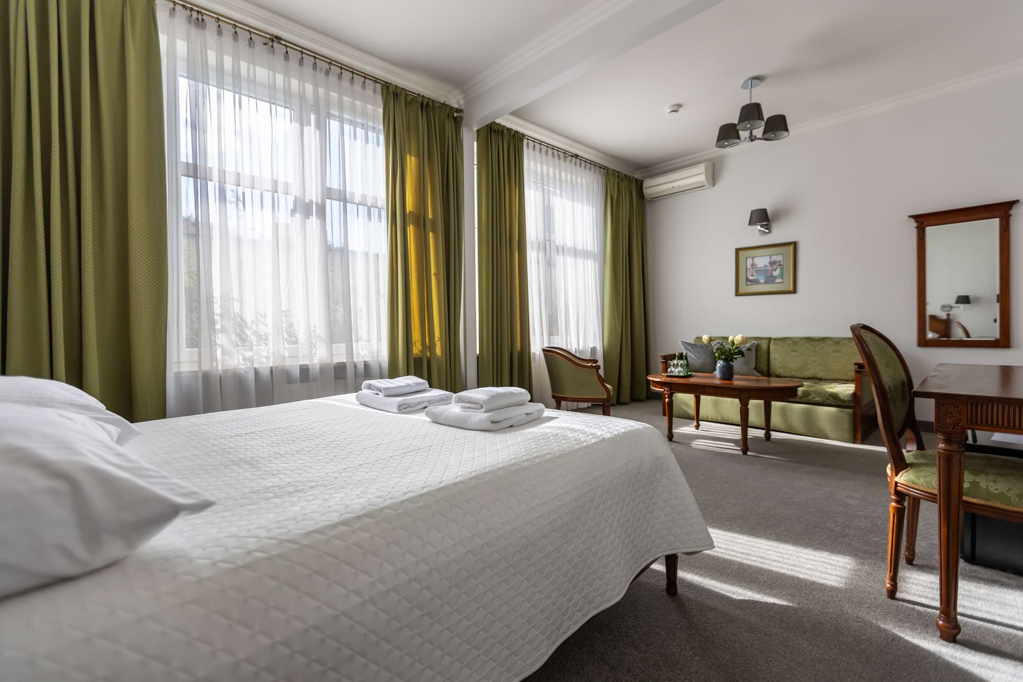 Przestronny pokój dwuosobowy Deluxe o powierzchni 30 m² to połączenie komfortu i elegancji. Goście mają do dyspozycji duże łóżko podwójne oraz rozkładaną sofę, część wypoczynkową i patio z widokiem. Pokój wyposażony jest w klimatyzację indywidualną, telewizor z płaskim ekranem i kanałami kablowymi, minibar oraz zestaw do parzenia kawy i herbaty. W prywatnej łazience czekają miękkie ręczniki, szlafroki, kapcie, zestaw kosmetyków oraz suszarka do włosów. Dopełnieniem wygody są sejf na laptopa, biurko, szafa, sprzęt do prasowania i bezpłatne Wi-Fi. Pokój przeznaczony jest dla osób niepalących.