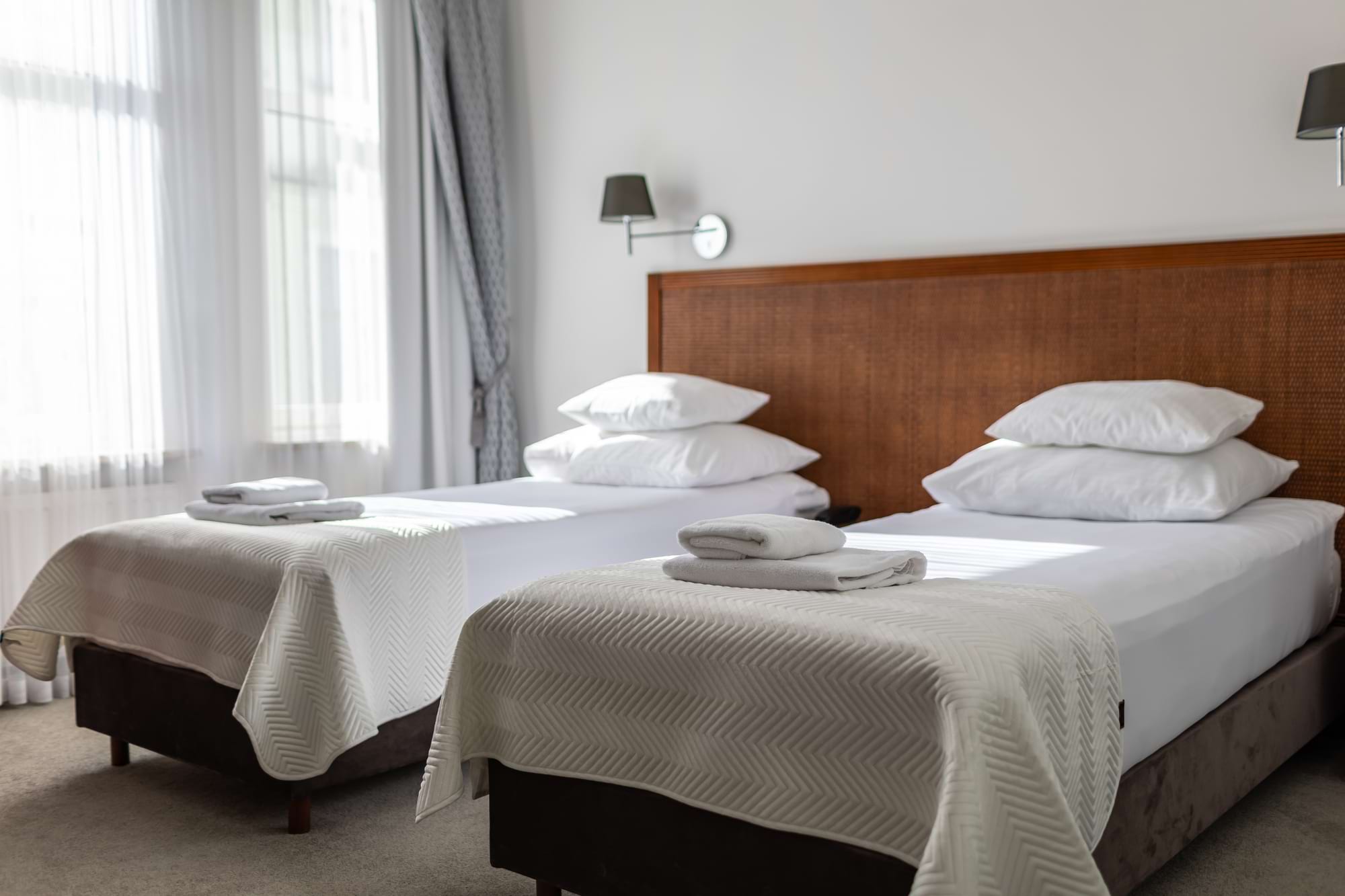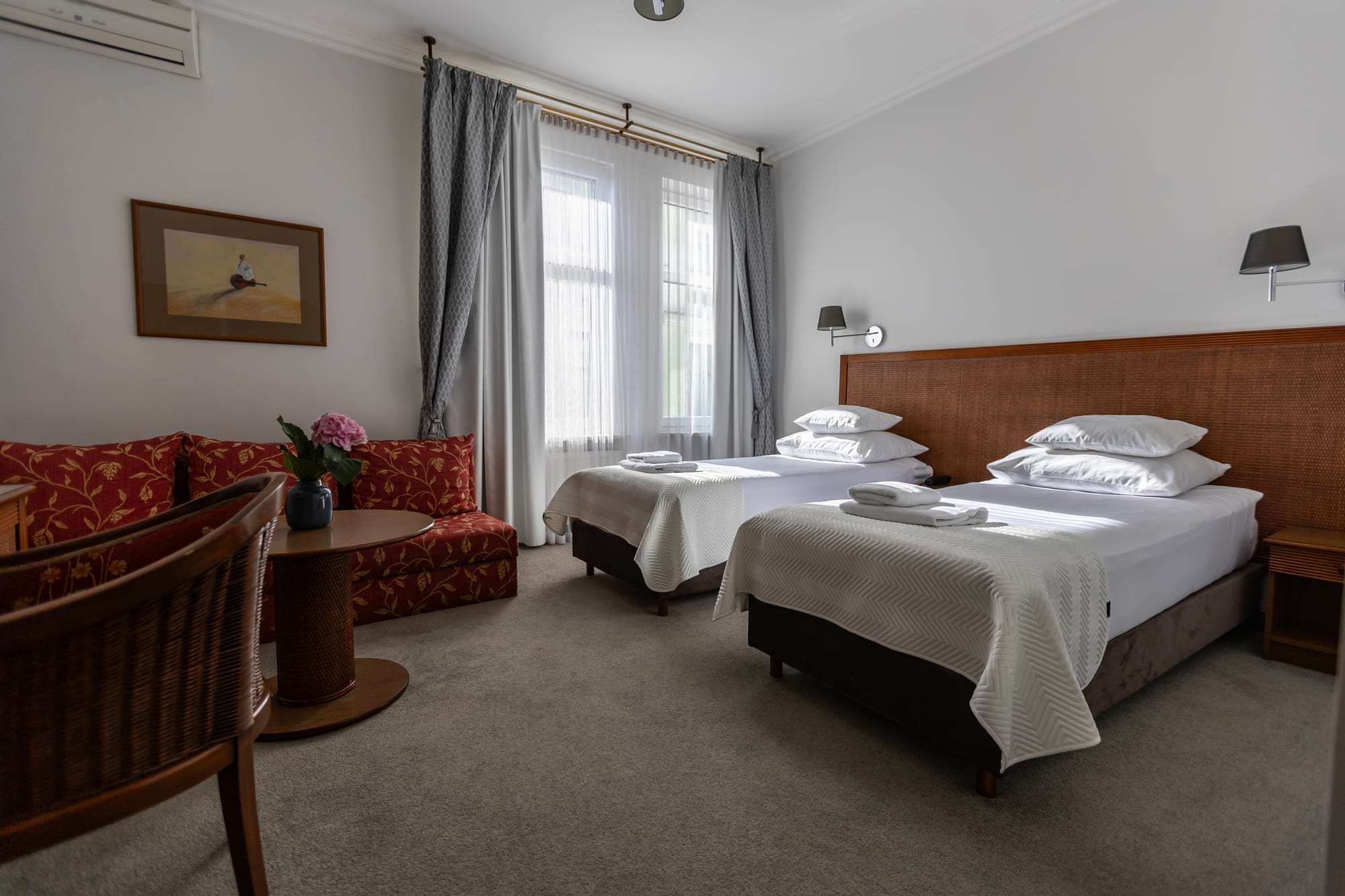 Pokój Dwuosobowy Standard o powierzchni 20 m² to funkcjonalna i wygodna propozycja dla dwóch osób. Wyposażony w dwa pojedyncze łóżka, klimatyzację indywidualną, telewizor z płaskim ekranem i kanałami kablowymi, minibar oraz zestaw do parzenia kawy i herbaty, zapewnia przyjemny pobyt. Z okien roztacza się widok na miasto. W prywatnej łazience Goście znajdą prysznic, miękkie ręczniki, kapcie, zestaw kosmetyków i suszarkę do włosów. Dodatkowe udogodnienia obejmują sejf na laptopa, biurko, szafę, sprzęt do prasowania i bezpłatne Wi-Fi. Pokój przeznaczony jest dla osób niepalących.